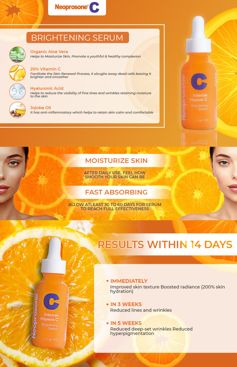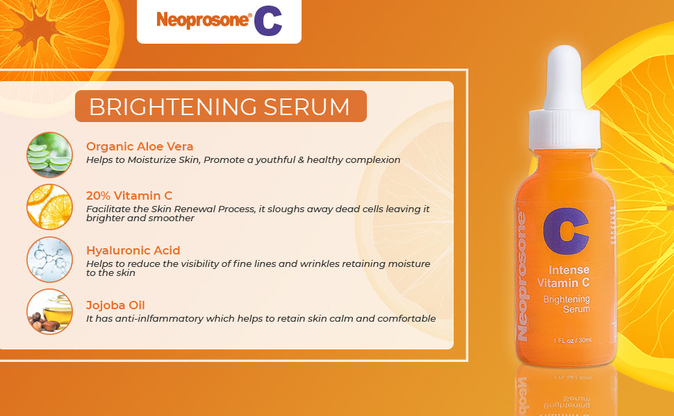 The Neoprosone Intense Vit C Serum 30ml works through an advanced formula rich in vitamin C, which has been proven to brighten and revitalize the skin. This formula helps reduce the appearance of dark spots and promotes a more even skin tone. Vitamin C acts as an antioxidant, protecting the skin from damage caused by free radicals. It also stimulates collagen production, which can help improve skin firmness and elasticity. The serum's lightweight texture allows for quick absorption, making it easy to incorporate into your daily skincare routine. The result is brighter and revitalized skin.
