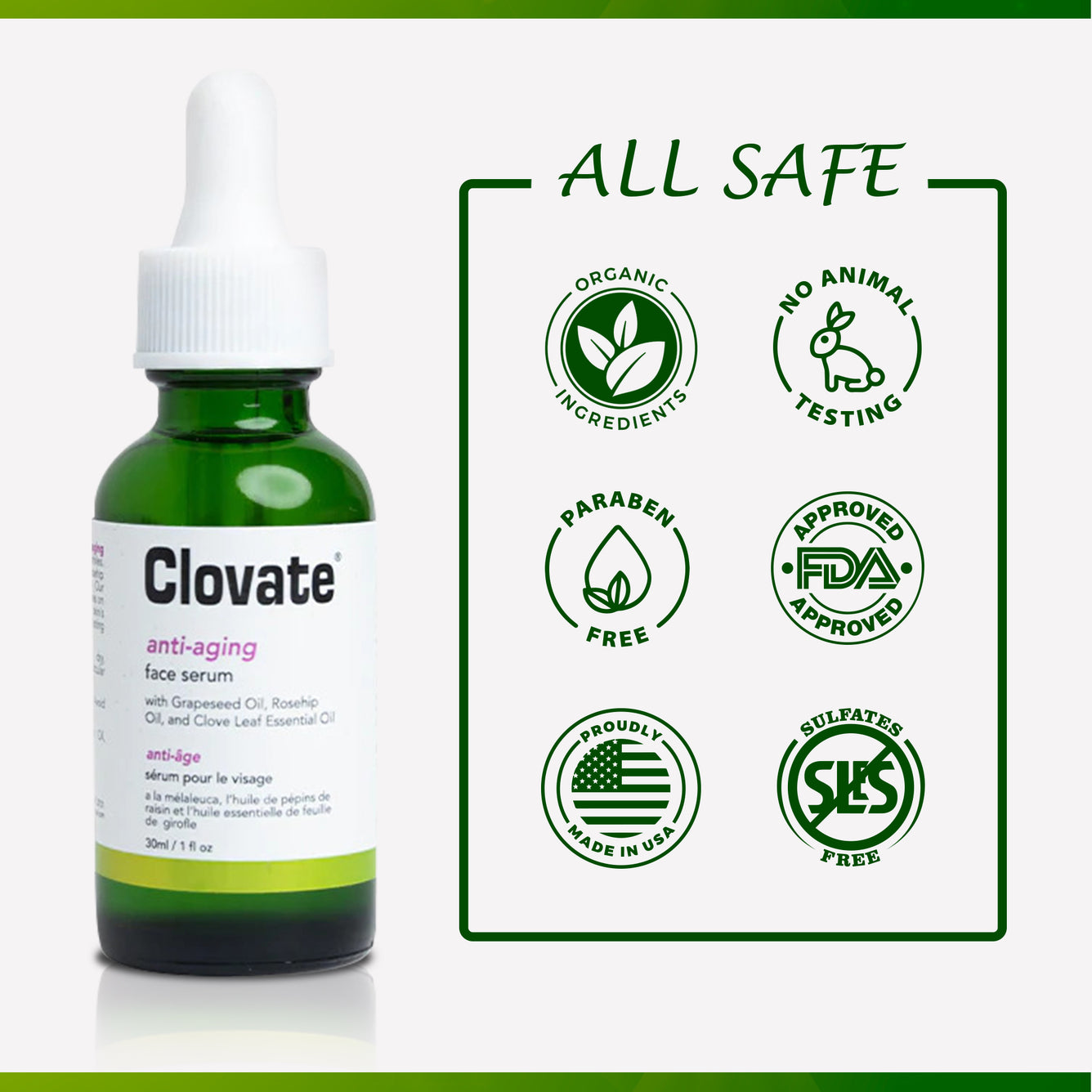 • Aplique 2 gotas de Clovate Anti-aging Serum sobre la piel limpia y seca