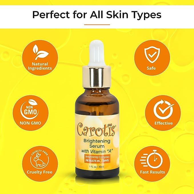 Carotis Lightening Serum is a skin-brightening serum with vitamin A that helps revitalize the skin, nurtures it, and softens it to an even tone with a healthy radiant glow. The results will start to show at the end of 7 days. Carotis Lightening Serum is your gateway to flawless and radiant skin.