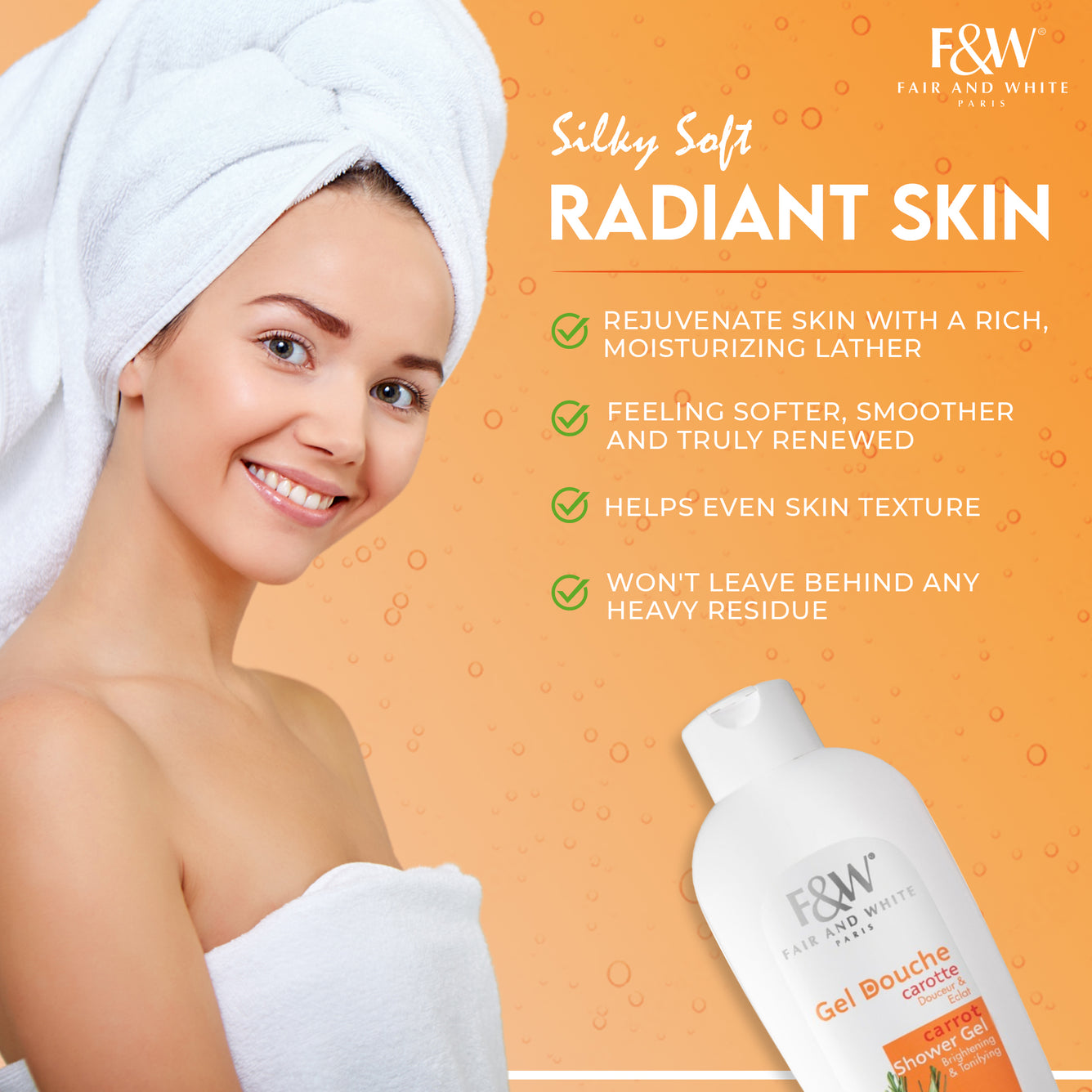 F&W Carrot Shower Gel is enriched with invigorating vitamins of Pomegranate and Melon extracts, triggering a refreshing and clean sensation to your skin. Its velvety texture and subtle carrot fragrance transform into a delicate foam, leaving skin glowing and naturally radiant.